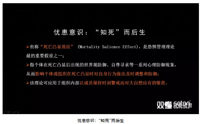 舉個例子。人類是所有動物當(dāng)中唯一知道自己要死的動物,從而對自己的死有所準(zhǔn)備、有所意識、有所恐懼,有所戒備,從而更早地讓我們有干預(yù),讓我們?nèi)ビ虾透淖?。這樣一種“死亡凸顯效應(yīng)”就叫“知死而后生”。