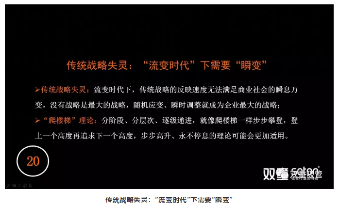 另一個觀點,我認為在一個流變的時代下,由于信息的高速迭代,傳統(tǒng)戰(zhàn)略已經(jīng)失靈。意思就是在流變時代下,傳統(tǒng)戰(zhàn)略的反映速度無法滿足商業(yè)社會的瞬息萬變。所以,沒有戰(zhàn)略有可能是企業(yè)最好的戰(zhàn)略。