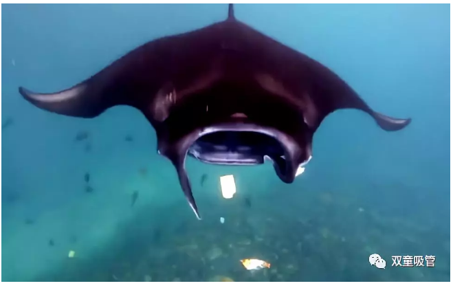 一只蝠鲼在滿是塑料垃圾的海洋中游來游去,還吞下了一塊塑料垃圾!