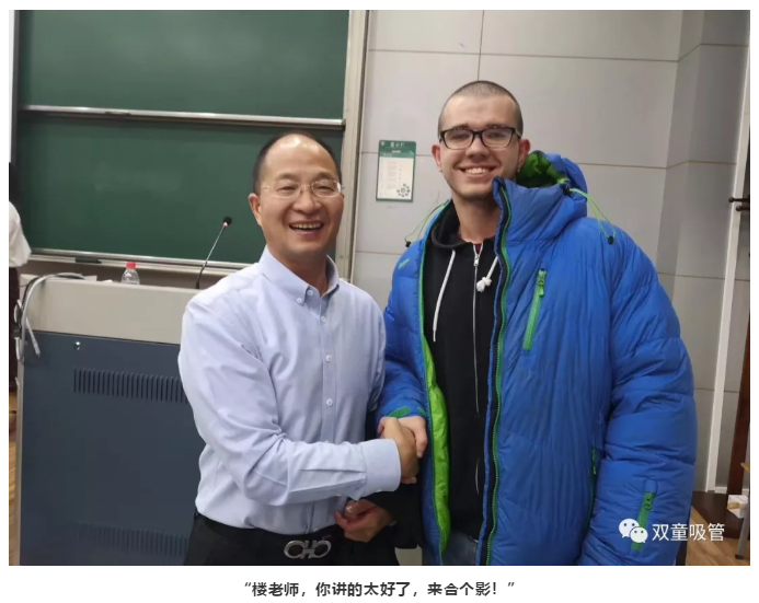 講完課后一位外國帥哥竟主動上前和樓總說:樓老師,你講的真好!我大部分都能聽懂!最后,樓總也和這位洋學(xué)生來了個大合影!