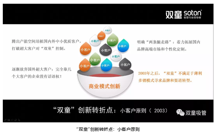 所以,這個時候我們逐漸放棄國外一些大客戶,開始實施小客戶原則,到現(xiàn)在積累了16000多家中小客戶,從而讓“雙童”不會受客戶所限。