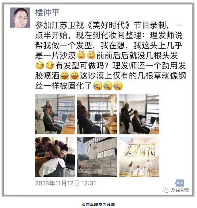 在節(jié)目錄制前,“雙童”樓仲平正在整理發(fā)型妝容,理發(fā)師說幫樓大大做個(gè)發(fā)型,吸管妞在一邊吐槽:樓總這發(fā)型有啥好整理的?圖中的“光頭”發(fā)型師回嘴:那還是要的,樓總頭發(fā)比我多!樓總也樂了:“我這頭上幾乎是一片‘沙漠’,還是你頭發(fā)多!”