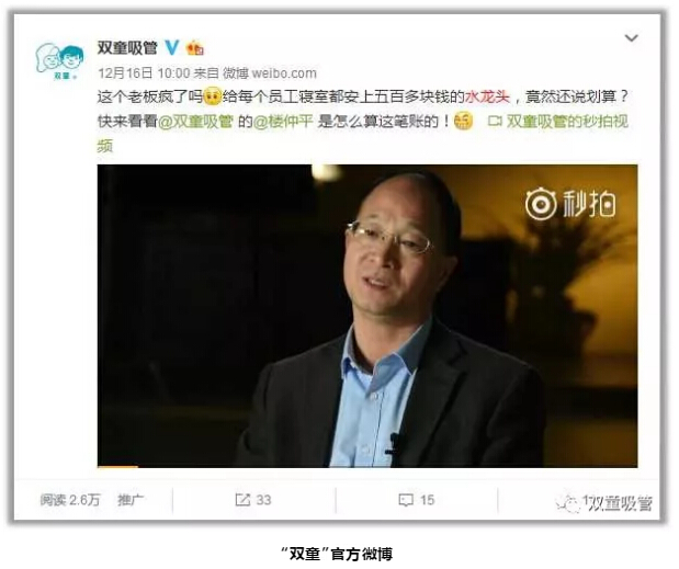 許多民營企業(yè)都認為不必給員工用太好的硬件,希望用最低的成本創(chuàng)造最大的價值。“雙童”官方微博曾發(fā)布的一條關(guān)于14年前老板給每個員工寢室配置了500多元水龍頭的微博就引發(fā)了網(wǎng)友的熱議,不少粉絲都很詫異一個水龍頭五百多元老板居然說不貴!