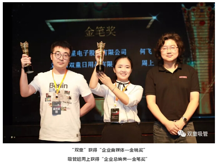 在大會現(xiàn)場,舉行了“第二屆中國優(yōu)秀企業(yè)自媒體”評選頒獎活動,雙童”榮獲了“企業(yè)新媒體—金銳獎”,吸管妞也獲得了壓軸獎項(xiàng)“企業(yè)總編類—金筆獎”!“這也證明了“雙童”的自媒體工作獲得了大眾及業(yè)界的認(rèn)可!