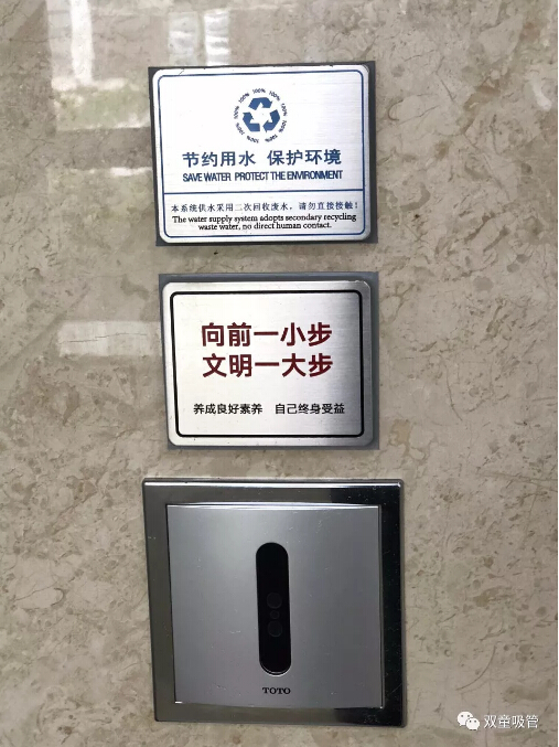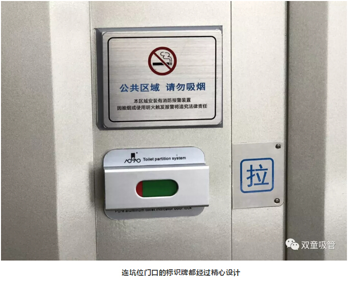 除此之外,“雙童”衛(wèi)生間還有許多文化引導的標示牌。如:每扇門上都會有“公共區(qū)域,嚴禁吸煙”的標識,每個蹲位后面都有“便后請沖水、素養(yǎng)高低往往體現(xiàn)在關(guān)上門自己獨處之時”等溫馨提示,從而引導員工提高自身素質(zhì),形成文化宣導氛圍!