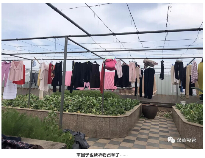 瞧!“雙童”人捂了一個(gè)月的衣物、被子曬滿了晾衣平臺(tái)!就連平時(shí)空著的屋頂菜園都被占領(lǐng)的滿滿當(dāng)當(dāng)?shù)?,和綠油油的蔬菜交相輝映……