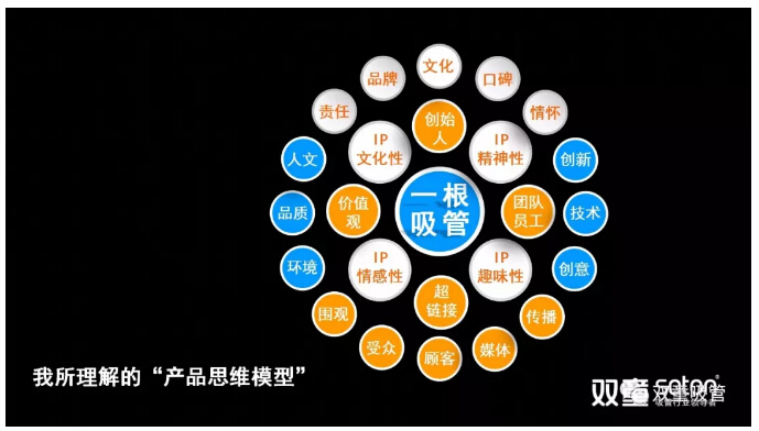 在這個模型中,吸管本身是一個產(chǎn)品,在產(chǎn)品本身內(nèi)核不發(fā)生改變的情況下,產(chǎn)品之外的“品質(zhì)”、“信譽”、“品牌”、“文化”等屬性不斷地外延,并通過“創(chuàng)始人”、“團隊員工”、“價值觀”等又形成了產(chǎn)品的種種不同屬性。