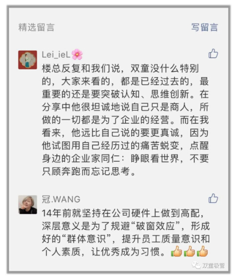 我和樓總其實之前就認(rèn)識,2017年我?guī)е懈邔觼磉^,但是今天來,感覺變化很大、企業(yè)文化建設(shè)很完善。您剛才提到2016、2017年企業(yè)的陣痛我之前沒想到,我們公司也是近兩年進入快速發(fā)展期,人才跟不上。原來想踩剎車、慢一點,現(xiàn)在我更堅定要跑快一點。今年,我決定我們整個公司就定下來要學(xué)習(xí)“雙童”。