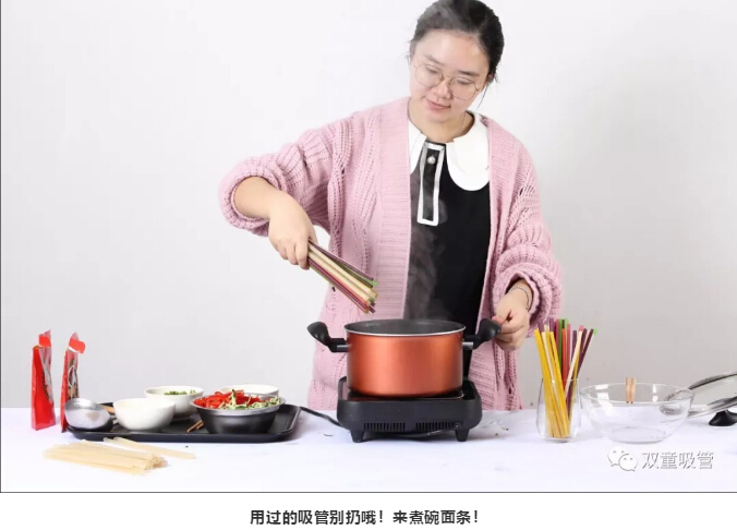 看!吸管妞和吸管妹妹正在把用過(guò)的吸管煮成面條呢!