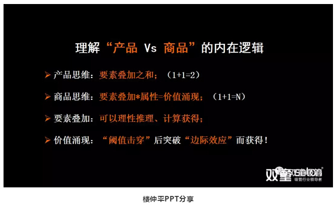 樓仲平引導(dǎo)大家思考“產(chǎn)品 Vs 商品”的關(guān)系,在這個(gè)模型中,產(chǎn)品本身(一根吸管)只是組成“商品”的基礎(chǔ)核心,產(chǎn)品只是企業(yè)的一個(gè)載體,是最基本的成本相加,1+1=2。