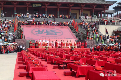 一進(jìn)入到秦王宮的大門,映入眼簾的就是一個(gè)巨大的“婚”字!來(lái)得早不如來(lái)得巧!剛好這里正在舉行秦漢婚禮!“雙童”人們一不小心就成了被宴請(qǐng)的賓客啦