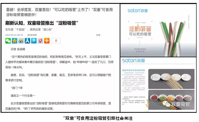 今年4月,歷經(jīng)三年潛心研發(fā),“雙童”可食用淀粉吸管震撼面世,突破了上述局限和問題的同時,還對環(huán)境十分友好,完全無污染!