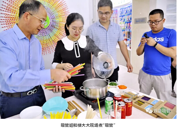 在各大媒體記者的見證下,“雙童”樓仲平和吸管妞在現(xiàn)場煮起了吸管,一把彩色吸管下鍋后,迅速軟化,幾分鐘后成了一碗彩色“面條”。