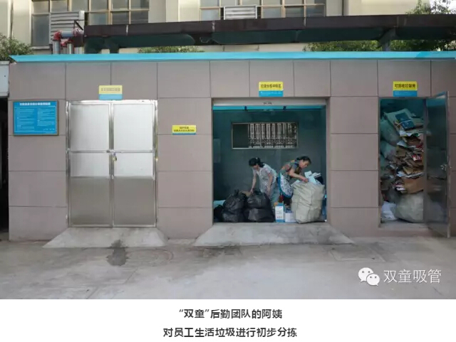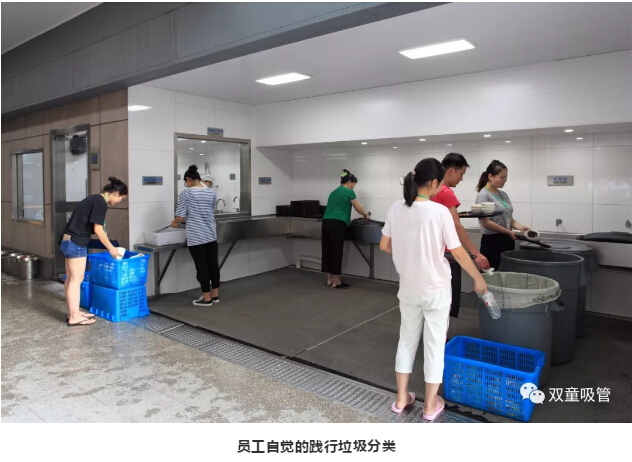 4.“雙童”大部分濕垃圾(餐廚垃圾)在餐廳的源頭給予分類,通過教育培訓(xùn)并在每張餐桌上都擺放著垃圾分類的標(biāo)語提示牌,提醒員工們就餐后及時按食物垃圾、衛(wèi)生紙、包裝物三種類別分類投放于洗碗出三個大桶中,其中的包裝物和紙張垃圾作為資源類垃圾回收、食物垃圾供應(yīng)給養(yǎng)殖戶作飼料回收,從而把企業(yè)所有的濕垃圾全部消滅;