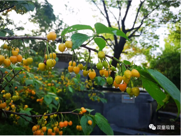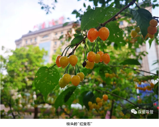 最初成熟的就是櫻桃了,由青轉(zhuǎn)黃,由黃轉(zhuǎn)橙,最后變成紅色,一團團一簇簇如紅寶石一般掛在枝頭,好不誘人!