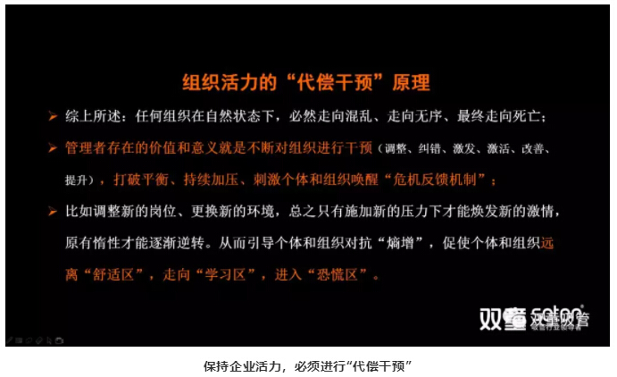 緊接著,樓仲平將熱力學(xué)第二定律的“熵增定律”引入到企業(yè)經(jīng)營當(dāng)中,引導(dǎo)大家更深入理解:在一個長期熟悉和舒適組織環(huán)境里大家都能輕松地做著自己在行的事情,無需過多努力就能完成任務(wù)。長此以往,組織能力必然處于自然衰減當(dāng)中,這是一種自然規(guī)律。