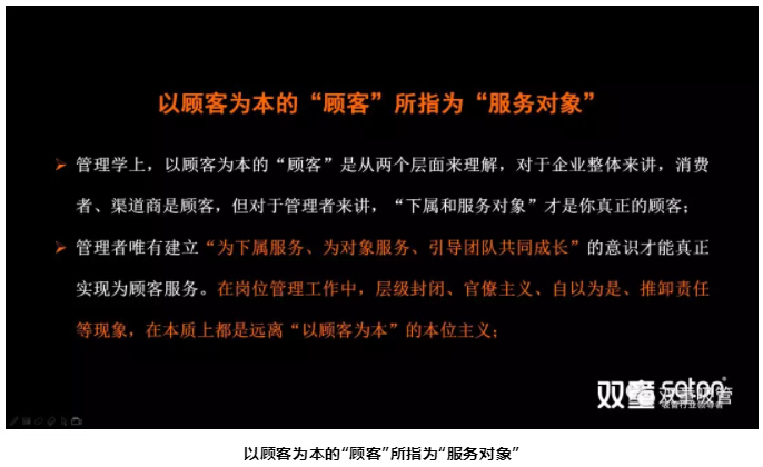 第一個概念,“雙童”提出了建立“以顧客為本”的時代價值觀。管理學(xué)上的“以顧客為本”要從兩個層面來理解:第一個層面是企業(yè)對外的顧客,也就是常規(guī)的消費者、渠道商;第二個層面,對于管理者來講,“下屬和服務(wù)對象”才是真正的顧客,一線員工才是真正的顧客。提出這一概念的根本目的,是為了打破“雙童”管理者現(xiàn)有的層級思想,徹底剝離管理層僅有的權(quán)利!