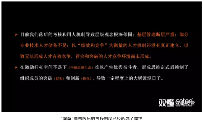 第二個概念,“雙童”提出建立以“奮斗者為本”的時代價值觀。“雙童”原來落后的考核制度已經(jīng)形成了慣性,從而導(dǎo)致基層管理斷層,部分專業(yè)技術(shù)人員儲備不足。