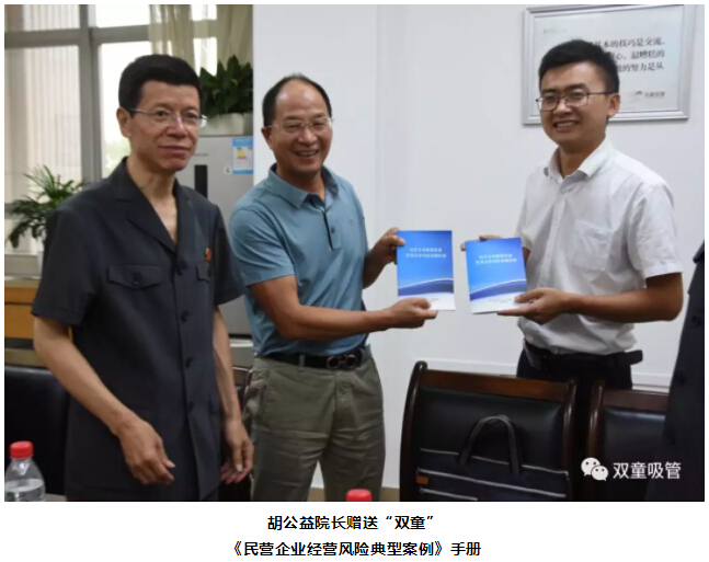 會上,胡公益院長也向樓仲平了解企業(yè)生產(chǎn)經(jīng)營過程中的司法需求,并贈送《民營企業(yè)經(jīng)營風(fēng)險典型案例》手冊。同時,“雙童”樓仲平也對胡公益院長一行人的親自到訪、上門服務(wù)及贈送《民營企業(yè)經(jīng)營風(fēng)險典型案例》手冊表示十分感謝!