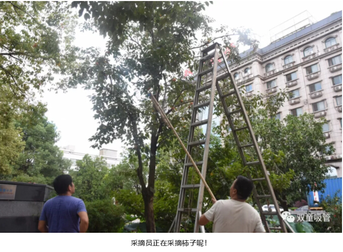 梯子、箱子皆已就位,采摘開(kāi)始!瞧!采摘員身輕如燕,一下就登上了梯子,瞬間就被金燦燦的柿子們“包圍啦”!