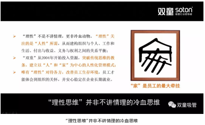 另一方面,公司建立了以“人”和“家”為中心的人性化管理模式。很多員工的家屬和小孩成群結(jié)隊(duì)地在食堂吃飯,并生活在企業(yè)內(nèi)部。同時(shí),“雙童”又一直引導(dǎo)員工“公司不是我的家”,理解“責(zé)、權(quán)、利”平衡下的奉獻(xiàn)關(guān)系,關(guān)注“人性”所需并給予員工必要關(guān)愛,從而達(dá)到組織與個(gè)人之間的關(guān)系平衡。