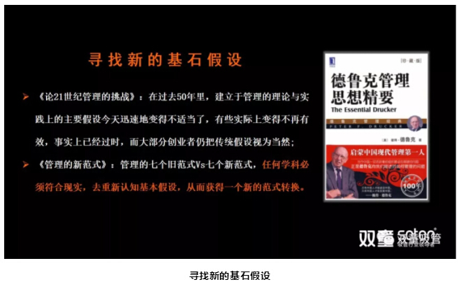樓仲平引用德魯克思想中管理新范式的內(nèi)容,引導(dǎo)大家更深入理解“范式轉(zhuǎn)換”:管理的新范式是指像管理學(xué)這一類社會科學(xué)的關(guān)于"現(xiàn)實的基本假設(shè)"。任何學(xué)科必須符合現(xiàn)實,去重新認(rèn)知基本假設(shè),從而獲得一個新的范式轉(zhuǎn)換。