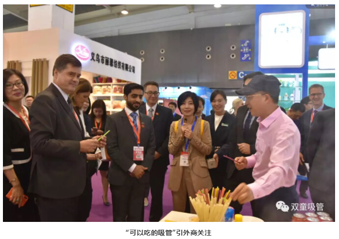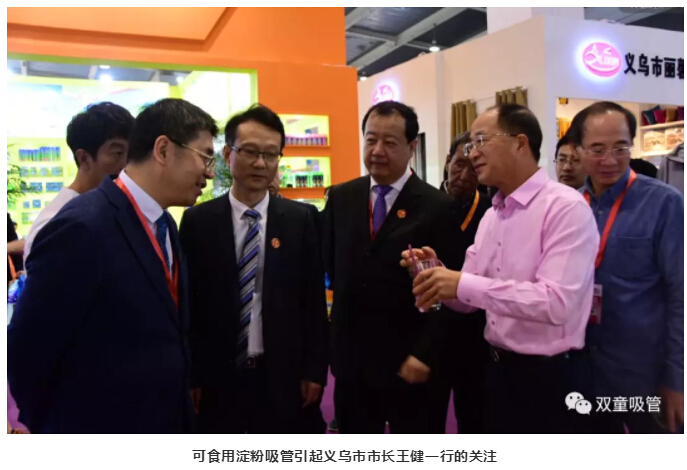 在義博會(huì)上,“雙童”可食用淀粉吸管成為了展會(huì)“大明星”,不僅引起了義烏市市長(zhǎng)王健一行和外商客人的關(guān)注,而且也吸引了大批新老客戶駐足洽談。