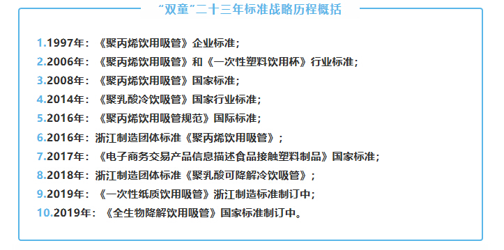 正是因?yàn)椤半p童”持續(xù)主導(dǎo)吸管行業(yè)標(biāo)準(zhǔn)的制定,使得“雙童”始終站在行業(yè)的制高點(diǎn),直接推動(dòng)企業(yè)的品質(zhì)管理體系的建立、改善和提升,直接影響企業(yè)的品牌傳播,并最終獲得吸管產(chǎn)業(yè)的話語權(quán)、規(guī)則權(quán)和定價(jià)權(quán),成為全球吸管行業(yè)的領(lǐng)導(dǎo)者!