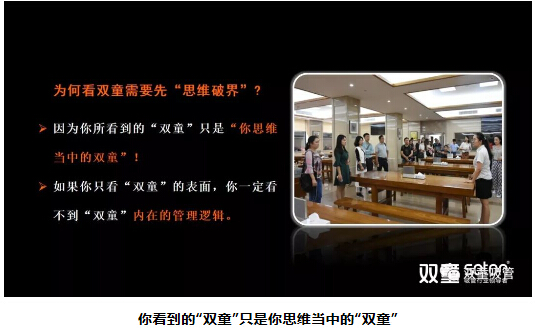 以“雙童”為例,很多人來“雙童”參觀都覺得“雙童”的硬件環(huán)境很好,但是每當樓仲平和參觀者分享時,他所做的第一件事就是引導大家進行“思維破界”,突破你的眼前所見,去了解和探究“雙童’為什么要這么做,這樣做的底層邏輯在哪里,從而徹底理解“雙童”內(nèi)在的管理邏輯!
