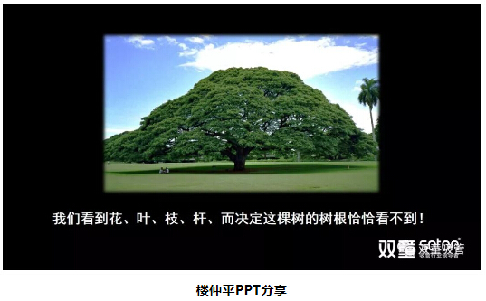 緊接著,樓仲平通過一棵樹的圖片,再次引導大家思考:我們通過圖片能看到樹的樹干、樹枝、樹葉等,但是真正決定這棵樹的樹根,卻并不能直接看到。所以,看不到的東西并不代表它不存在,反而往往是事物的根基和底層邏輯!