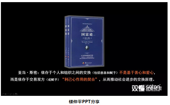 當晚,樓仲平將二十年前閱讀,并一直影響他至今的書籍《國富論》(此書被譽為“西方經(jīng)濟學圣經(jīng)”)也帶到了現(xiàn)場,并直白地告訴大家,正是因為以亞當斯密的《國富論》為代表的西方哲學思想影響,他才能夠理解商業(yè)的底層邏輯,才能夠從另一個維度來認知:“雙童”的所作所為,并不是基于善心和愛心,而是基于商業(yè)交換原則下“利己心作用的契合”!