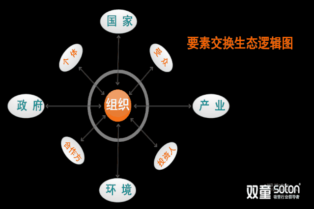 講到這里,樓仲平為了讓現(xiàn)場觀眾更好地理解,便展示了一副要素交換生態(tài)邏輯圖,清晰地向大家說明:組織在發(fā)展過程中,與環(huán)境、產(chǎn)業(yè)、政府、國家等宏觀社會產(chǎn)生了鏈接,這種鏈接實際上是各種要素的相互交換和賦予。在合情、合理、合法、合乎道義的交換過程中,本質(zhì)上雙方出于“利己”的目的,但同時又給對方創(chuàng)造了價值,讓雙方都有所獲得,從而最終實現(xiàn)了“利他”。