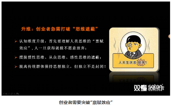 接著,樓仲平通過“稟賦效應”的案例講述,讓大家理解到人一旦獲得就不愿意放棄,思想一旦陷入舊的傳統(tǒng)范式中,就極難轉換到新的思維范式中去。因此,創(chuàng)業(yè)者需要打破慣性思維、從眾思維、感性思維的“思維遮蔽”,突破“稟賦效應”,脫離傳統(tǒng)群體保持思想獨立,從而實現(xiàn)認知升維!