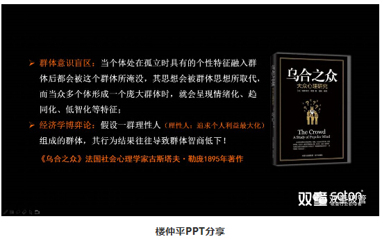 講到這里,樓仲平又向大家推薦了法國社會心理學家勒龐的著作《烏合之眾》,該書中提到了群體意識盲區(qū):當個體處在孤立時具有的個性特征融入群體后都會被這個群體所淹沒,其思想會被群體思想所取代,而當眾多個體形成一個龐大群體時,就會呈現(xiàn)情緒化、趨同化、低智化等特征。