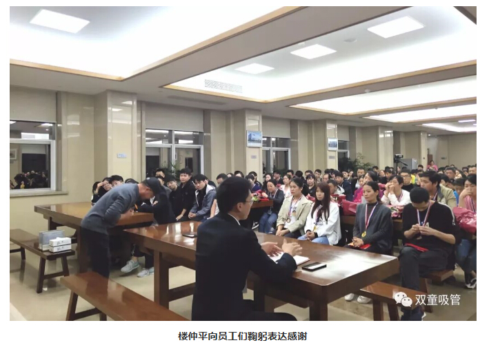 樓仲平三鞠躬感謝基層員工 表彰大會(huì)開始后,“雙童”樓仲平再次為員工站臺(tái),進(jìn)行肺腑發(fā)言,并連續(xù)三鞠躬感謝基層員工: 一鞠躬:感謝口杯車間兩個(gè)班組的努力奮斗 “第一點(diǎn),我每個(gè)月必然會(huì)參加員工表彰大會(huì),除了出差趕不回來的突發(fā)狀況,一定會(huì)每個(gè)月給大家站臺(tái)。另外,我要求每月發(fā)放不少于二十萬優(yōu)秀員工獎(jiǎng)金作為管理指標(biāo),我不參與任何評(píng)價(jià)和監(jiān)督,我相信時(shí)間長(zhǎng)了團(tuán)隊(duì)總得去琢磨這筆錢怎么給才公平合理,讓更多人能夠覺得自己受到尊重,我覺得這是改革的價(jià)值所在。