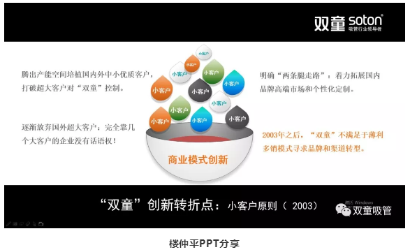 十多年前,當(dāng)別的企業(yè)都忙著擴(kuò)大生產(chǎn)規(guī)模時(shí),“雙童”卻反其道而行之。2003年,我們提出了“小客戶原則”,前后花了5年時(shí)間“砍掉”了那些對“雙童”沒有正向價(jià)值的大客戶,因?yàn)檫@樣的客戶會(huì)導(dǎo)致企業(yè)沒有任何自主權(quán)和定價(jià)權(quán),無法形成良性循環(huán)。