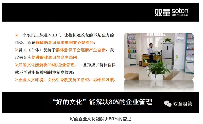 我再舉兩個(gè)例子來幫助大家理解。第一,許多到訪“雙童”的客人會(huì)發(fā)現(xiàn):“雙童”的環(huán)境極致干凈,甚至于餐廳都不需要阿姨打掃,為什么呢?因?yàn)槲覀兺ㄟ^引導(dǎo)員工學(xué)習(xí),讓他們形成了群體意識。員工通過長時(shí)間自律提升后,就不再需要他人監(jiān)督,就會(huì)形成了良好的行為習(xí)慣,并自覺遵守企業(yè)的準(zhǔn)則規(guī)范!所以,衛(wèi)生不是阿姨打掃出來的,是員工自律的結(jié)果!