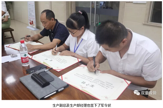 2019年8月20日,在"雙童"推動企業(yè)改革后的第一次員工大會上,口杯技術(shù)班組長張德勝鄭重地簽下了口杯技術(shù)班組的軍令狀,承諾在2019年8月1日至2019年12月31日期間,克服一切困難,全力以赴、不找借口,保證完成公司預(yù)定的產(chǎn)能目標(biāo),未達(dá)成目標(biāo)則自愿接受所有懲罰。
