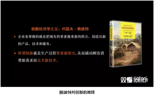 創(chuàng)新經(jīng)濟(jì)學(xué)之父約瑟夫·熊彼特,曾在其著作《經(jīng)濟(jì)發(fā)展理論》中對(duì)“創(chuàng)新”做了重新定義:所謂創(chuàng)新就是生產(chǎn)過程中的要素新組合,從而撬動(dòng)顧客消費(fèi)新需求而無關(guān)新技術(shù)。企業(yè)家要做的就是把現(xiàn)有的要素做重新的組合,創(chuàng)造出新的產(chǎn)品、技術(shù)和服務(wù)。其本質(zhì)就是所謂的創(chuàng)新。