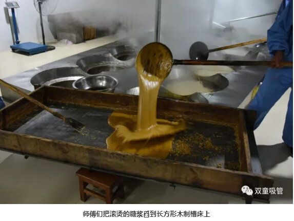 等到將全部濃稠的糖漿起到最末端的一口鍋中,看看差不多了,就將滾燙的糖漿,舀到一個長方形的木制槽床上,制作成精細的紅糖,這些紅糖可以加工成麻花等紅糖產(chǎn)品。