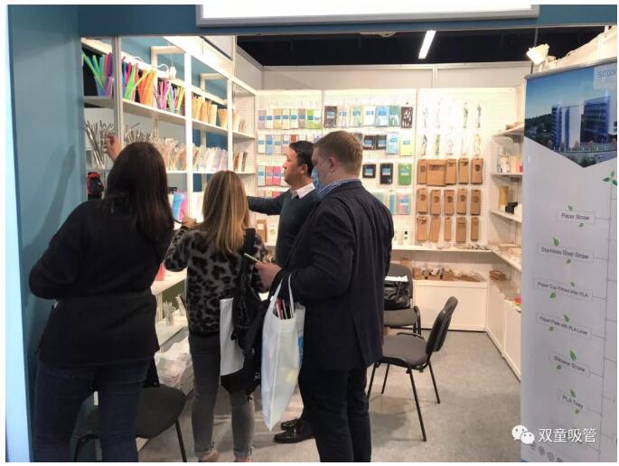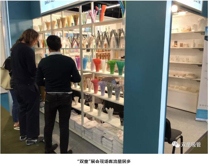 展會(huì)期間,盡管中國館的參展商不多,但每天都有絡(luò)繹不絕來自全球各地的參展商到“雙童”展位駐足洽談,對(duì)“雙童”的各類吸管、可降解材質(zhì)包裝盒等產(chǎn)品表示了濃厚的興趣。
