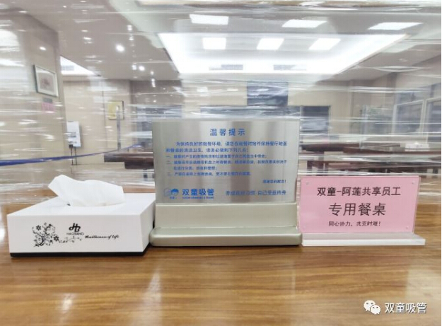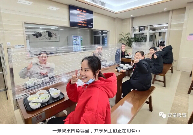 為了讓“共享員工”安心在企業(yè)工作,“雙童”也免費提供“兩葷一素”標準的中餐與晚餐。疫情下,為了安全起見,“雙童”特地規(guī)劃出共享員工的專屬餐桌,座位之間用保鮮膜隔板隔開,同時也引導大家排隊取餐保持一米距離,餐桌四角就坐,讓大家放心就餐。