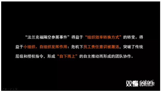 “法蘭克福隔空參展事件”得益于“組織效率轉(zhuǎn)換方式”的轉(zhuǎn)變,公司通過機(jī)制和體制的變革,把核心管理者轉(zhuǎn)變?yōu)榻?jīng)營者,在企業(yè)內(nèi)形成若干個小組織和自組織,從而促進(jìn)組織效率的提升。
