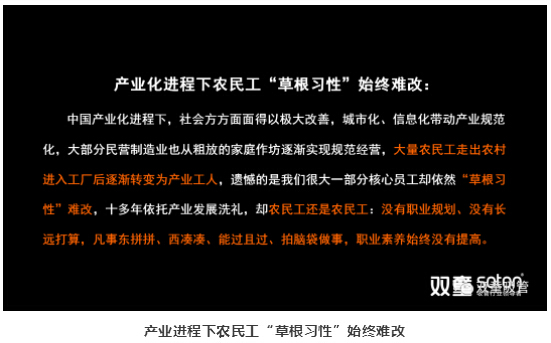 為何“雙童”要強(qiáng)調(diào)提升工作效率呢?在產(chǎn)業(yè)化進(jìn)程下,大量農(nóng)民工進(jìn)入工廠后逐漸轉(zhuǎn)變?yōu)楫a(chǎn)業(yè)工人,但遺憾的是我們很大一部分核心員工卻依然“草根習(xí)性”難改,沒有職業(yè)規(guī)劃、沒有長遠(yuǎn)打算,職業(yè)素養(yǎng)始終沒有提高。