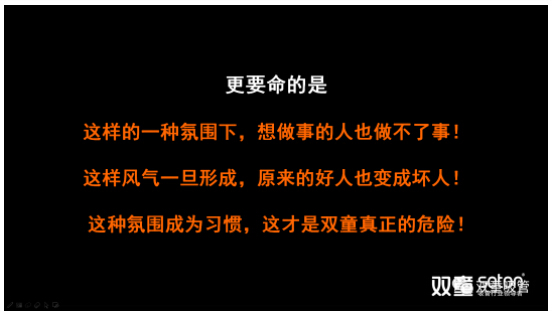 更要命的是,這樣的風(fēng)氣一旦形成,原來的“好人”也變成“壞人”。這種氛圍一旦形成,“雙童”想做事的員工也做不了事。這樣的氛圍成為習(xí)慣,這才是“雙童”真正的危險(xiǎn)!