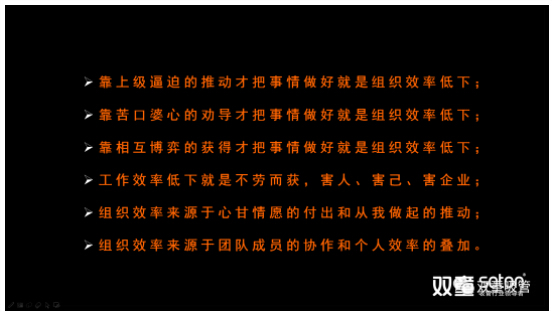 實(shí)際上,組織效率來源于心甘情愿的付出和從我做起的推動;組織效率來源于團(tuán)隊(duì)成員的協(xié)作和個人效率的疊加。員工的效率就是組織的效率。