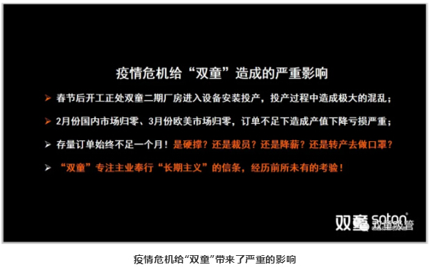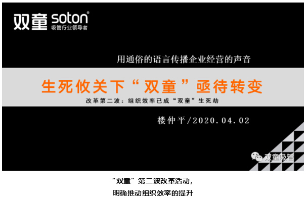 因此,在危機(jī)來(lái)臨之時(shí),“雙童”并沒(méi)有恐慌,而是選擇抓住機(jī)會(huì),迎接挑戰(zhàn)。但是在很多身邊的同行都開(kāi)始轉(zhuǎn)行做口罩,做防疫物資的時(shí)候,奉行長(zhǎng)期主義的“雙童”認(rèn)為,轉(zhuǎn)行踩風(fēng)口做口罩我們并不擅長(zhǎng)。所以,4月2日,“雙童”開(kāi)始推動(dòng)企業(yè)第二波改革活動(dòng),明確推動(dòng)組織效率的提升。