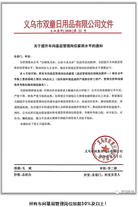 在危機(jī)裁員降薪風(fēng)潮盛行的當(dāng)下,恰恰是我們推動(dòng)組織變革的好時(shí)機(jī)。所以,“雙童”借力于這樣一個(gè)機(jī)會(huì),發(fā)布了加薪文件,給所有車間基礎(chǔ)管理崗位加薪30%及以上!也希望通過(guò)此舉引進(jìn)更多的優(yōu)秀管理人才,實(shí)現(xiàn)優(yōu)勝劣汰,從而激發(fā)組織中每個(gè)員工的積極性。