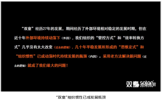 此外,我們還認(rèn)識(shí)到,疫情危機(jī)后,外部環(huán)境的動(dòng)蕩性將持續(xù)加劇,過(guò)去的邏輯對(duì)未來(lái)逐漸失效,“雙童”幾十年平穩(wěn)發(fā)展所形成的“組織慣性”已經(jīng)成為了持續(xù)發(fā)展的瓶頸,因此,“雙童”積極推動(dòng)組織做出改變。