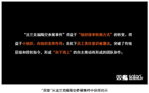 在這個(gè)過(guò)程中,組織效率發(fā)生了轉(zhuǎn)變,從以往的“要你做”,變成了現(xiàn)在的“我要做”,突破了指令的授權(quán),實(shí)現(xiàn)了團(tuán)隊(duì)的協(xié)作。可以說(shuō)如果“雙童”沒(méi)有進(jìn)行組織轉(zhuǎn)變,這樣的事情就不太可能發(fā)生。